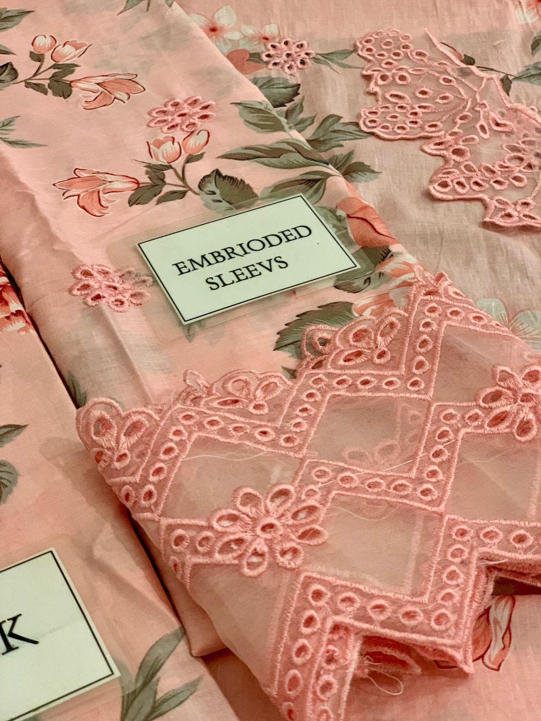 This 3-piece women's unstitched embroidered suit is a perfect addition to your wardrobe. The lawn shirt features patch work on the neckline and sleeves, while the front and back are adorned with intricate prints. The chiffon dupatta is embroidered, adding a touch of elegance. Package includes shirt, trouser, and dupatta, all in 2.5 gazz cutting, and comes in a beautiful pink color. Please note that there may be slight measurement and color variations.